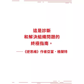 這是診斷和解決組織問題的終極指南。沒有人比這兩位專家更了解如何讓工作變得更好,他們撰寫了一本非常有洞見、吸引人、有實證基礎又可實行的著作。如果每一位領導者都認真對待本書中的觀點,世界就會變得更富有成效,沒那麼悲慘。──亞當.格蘭特,《逆思維》作者