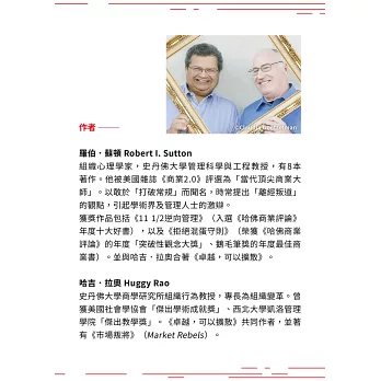 蘇頓和拉奧為我們提供了無數的智慧結晶,每一個都是無價之寶,他們將管理重塑為一門藝術,讓事情能順利完成,還避免不必要的掙扎。他們從經典著作和最新研究中汲取了重要的見解,提出令人信服的觀點,強調摩擦應該成為關注的重點,還提供無數可以應用在工作上的實用建議。我保證,他們深具人性的論點會贏得你的心,改變你的行為,並徹底轉變你的公司。──艾美.艾德蒙森,哈佛商學院諾華領導力與管理學教授、《正確犯錯》作者
