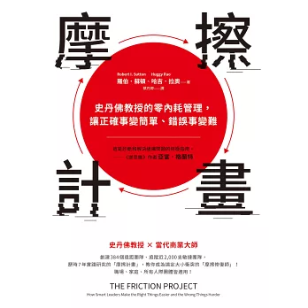 摩擦無論好壞,都是組織中最重要但最不為人所知的元素。如果處理得當,你的團隊一覺醒來就會興高采烈地投入工作。如果處理不當,你就會讓每個人都痛苦不堪,削弱他們實現願景的能力。羅伯.蘇頓和哈吉.拉奧在過去幾年來研究了各種公司摩擦問題的原因和解決方法。他們精煉出自己的經驗教訓,幫助你和團隊在公司中把正確的事情得更容易,把錯誤的事情變得更困難。每一位高階主管、投資者、董事會成員和領導者都應該購買《摩擦計畫》。──里德.霍夫曼,領英共同創辦人