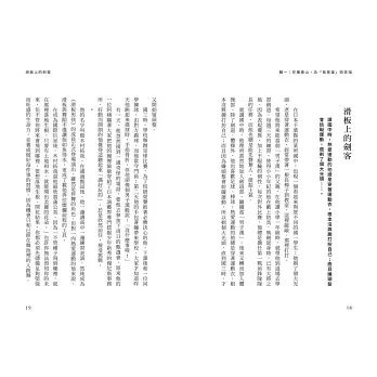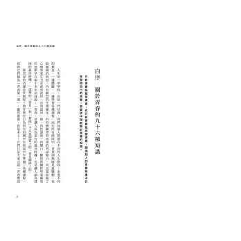 只有青春能啟發青春,也只有青春能說服青春。所以我特別挑選九十六個具代表性的人物,從他們的青春中找出某段特殊的經驗,並和他們往後的輝煌人生建立某種聯結,目的是想讓每個故事都能提供關於青春的一種知識。從這些青春故事裡,我們很快就會發現,成功或令人滿意的自我追尋並沒有什麼固定的軌跡,不只條條大路通羅馬,不少人所走的方向甚至還完全相反。這不是要讓人無所適從,而是希望大家能兼容並蓄,用這些知識排列組合出引領、照亮自己青春的知識。