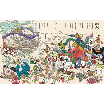 貓咪妖怪也會賞櫻花、逛祭典、看比賽、過年節?全書以略帶浮世繪的風格,融合東西方的文化與季節元素,刻畫出豐富的貓妖異想世界。不僅有十二個月的滿版大圖,還埋藏了許多讓人會心一笑的小巧思,每一頁都有能夠細細品味、前後呼應的驚喜。