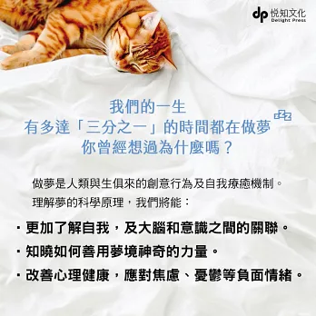 準備好了嗎?翻開這本書,進入睡眠與清醒的縫隙中,探索奇妙的夢境世界!」──蔡宇哲/哇賽心理學創辦人兼總編輯