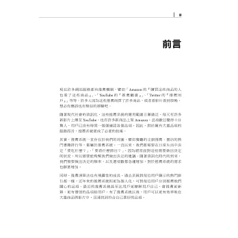 本書以「運用在實際工作上」為目的,提供作者自身的實務經驗和各種成功、失敗的例子,著重於實際建構一個推薦系統,適合新手入門。