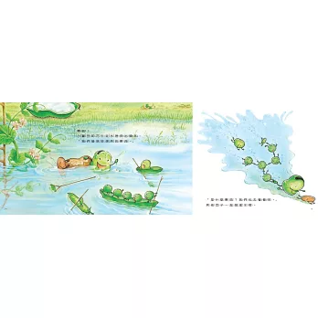豆子朋友們手牽手潛入水裡,四周有小氣泡波波波浮上水面,水面下可以看到柔和的陽光射入水面,畫面令人心曠神怡。——日本亞馬遜書評