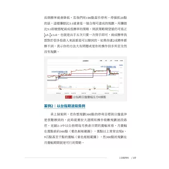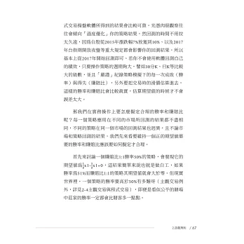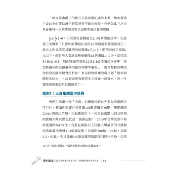 在這本書,軌道鞅把他的投資心得寫出來了。我可以從書中看到他把當年碩士論文學習到的功夫也用上了,大量使用總計資料庫與計量軟體。但是更重要的是,這一本書就是他的投資錦囊妙計。前兩章,他先從商品的選擇開始講起,然後用統計學的角度去討論如何在投資的博弈賽局中取得最有利的地位。再來的三、四章是本書的核心,軌道鞅教你以主力及成本的角度看問題,研究進出操作,由凱莉公式的風控去避免連續虧損所造成的資金用罄,進而往大賺小賠的目的進行投資。內容雖沒有辦法保證你能一次就獲利致富,但是長期以往,大數法則下一定會獲利致富。