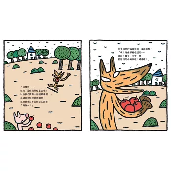 原來這個森林裡的小豬,從來沒有看過狐狸。於是,狐狸爸爸和小豬採了好多紅通通的蘋果。