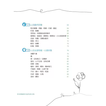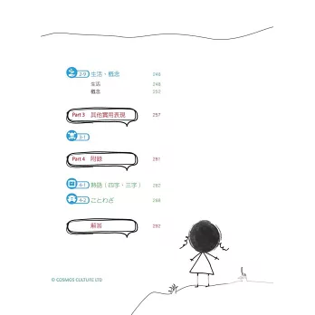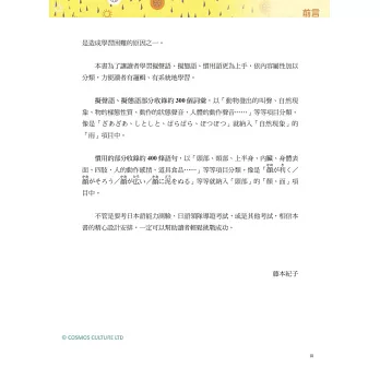 2.慣用語:精選約 400 條常用的慣用語,並依「頭部、頸部、上半身、內臟、身體表面、四肢、人的動作感情、道具食品」等項目詳加分類,便於理解與記憶。