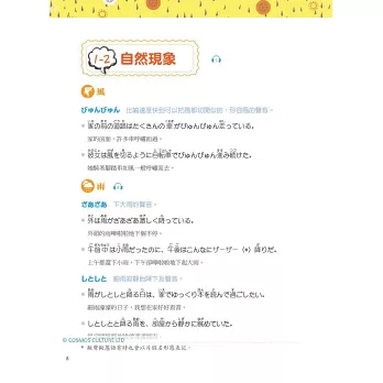 1.擬聲語・擬態語:收錄約 300 個日常生活中常用的擬聲、擬態語,按照「動物叫聲、自然現象、物體狀態、動作聲音、人體動作聲」等分類,幫助讀者全面掌握生動的表現方式。
