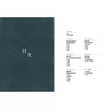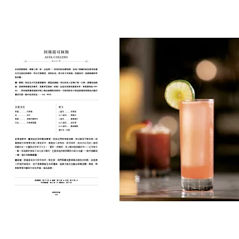 上工前 簡介 本書使用指南 Part I 雞尾酒的調製技巧 調出技藝精湛的雞尾酒 平衡 溫度 質地 香氣 酒譜 Part II 品味哲學 用扣人心弦的背景故事來概念化雞尾酒 靈感 意圖 寬慰 好奇心 酒譜 Part III 酒譜發展 讓酒譜更成熟並富有深度 呼應 相得益彰 並列 敘事弧 酒譜 Part IV 調酒原則 透過不同視角看調酒 個人風格 儀式 款待 酒譜 Part V 創作過程 全程自創酒譜 草擬和潤飾酒譜 最終案例研究 下班後 自製材料 作者群&致謝辭 索引
