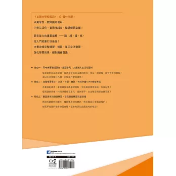 本書搭配課本,著重練習各課學習重點,有效檢視學習成效、加強記憶!每兩課結束後,特別準備複習單元,提供單字、文法整理和綜合練習題!