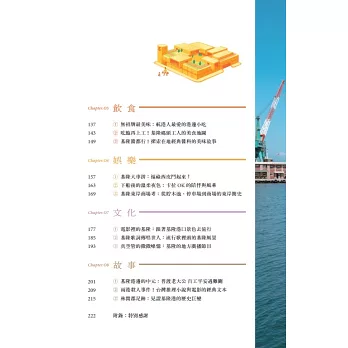 本書擬從陽明海洋文化藝術館出發,望向四方,凝視港口,了解港與城的共生關係。我們擬想八個篇章,用新的航港角度,重新訴說關於這座城市,你可能聽過的一些故事,賦與其新的意義。