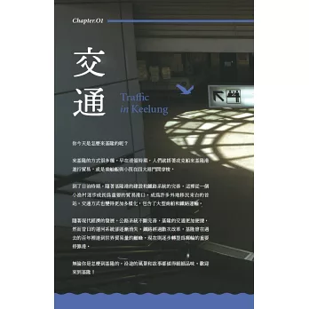 第一篇為交通篇。港口的誕生是劃時代的大事,清代劉銘傳開始有建港的構想,但真正落實為現代化的港口是在日本時代。為配合築港工程,整座城市產生天翻地覆的變化,推行市區改正,填海造陸、棋盤式街道規劃、整治河流,確立了今天城市的規模格局。日本政府透過縱貫鐵路將基隆、高雄相連,南北交通縮短至12小時,同時配合貨運建設海港城市獨有的臨港線鐵路。其後隨著人口的持續湧入,原先的運河退讓給予更多居住的空間,市區的風景也隨之慢慢改變。