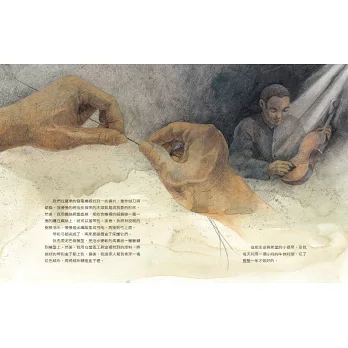 在《希望小提琴》這本書的繪圖表現上,我希望能展現遭受迫害的悲情筆觸,由於多數內容是回憶與想像情境,所以我多半運用影像重疊的構圖方式處理;另一方面希望在色調的呈現能同時兼顧生活的無奈與綠島鮮明的生態環境。由於白天在學校教書,作畫期間也歷經搬家等瑣事,所以繪製時間超出預計許多,謝謝出版社和佳慧的體諒,很高興這本書能順利出版。