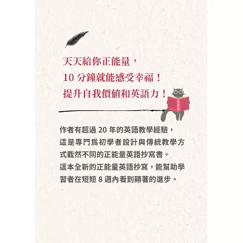 作者有超過20年的英語教學經驗,專門為初學者設計與傳統教學方式截然不同的正能量英語抄寫書。作者認為,不論學習者的年齡、個性或知識背景,都應該從符合自己程度的素材開始學習。