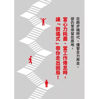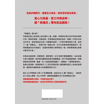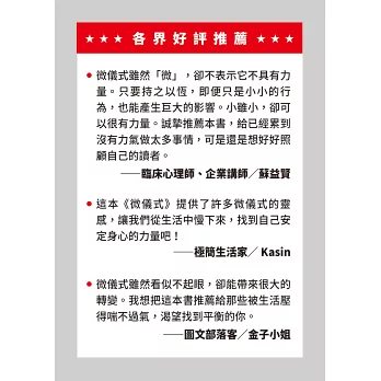 .微儀式雖然「微」,卻不表示它不具有力量。只要持之以恆,即便只是小小的行為,也能產生巨大的影響。小雖小,卻可以很有力量。誠摯推薦本書,給已經累到沒有力氣做太多事情,可是還是想好好照顧自己的讀者。——臨床心理師、企業講師/蘇益賢