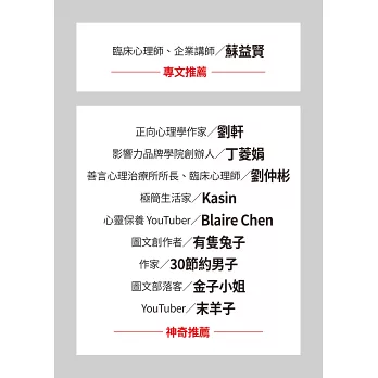 ★正向心理學作家/劉軒、影響力品牌學院創辦人/丁菱娟、善言心理治療所所長、臨床心理師/劉仲彬、極簡生活家/Kasin、心靈保養 YouTuber/Blaire Chen、圖文創作者/有隻兔子、作家/30節約男子、圖文部落客/金子小姐、YouTuber/末羊子——神奇推薦!