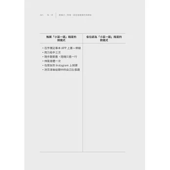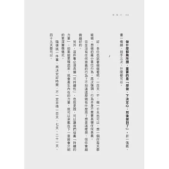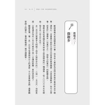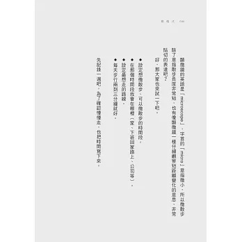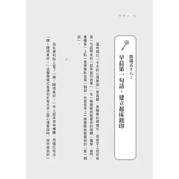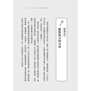 可能是在紙上或手機上的記事本上畫一條線,有時是日常生活中常見的瑣碎行為,例如折棉被、光腳走路、抄寫帶給你勇氣的佳句、閱讀一行吸引你目光的字句、起床後對自己說一句鼓勵的話等。一件每天都會做的小事,成為了一種「微儀式」,就算只剩一點點力氣,也可以毫無負擔地輕鬆執行。短時間看起來沒什麼變化,但當所有瑣碎小事聚集在一起,將會累積成比想像中更大的力量。