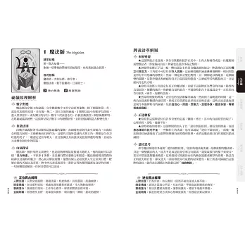 ★從牌的順序和定位、數字編號,解釋牌的主題和設定,再針對祕儀原理解析,從數字或位階的對應說明,到象徵法則和主題內涵探索,然後延伸至占卜的正位牌義。