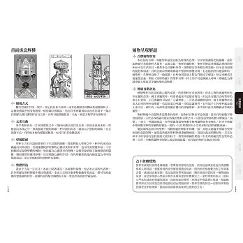 ★然後以畫面來做分析,三副歷史性的塔羅牌圖在此供比較,是精選而具有歷史傳承意義的塔羅。《馬賽塔羅》和《偉特塔羅》是塔羅歷史分期的起始,而《華奇特塔羅》則居於兩者間的銜接地位,一併從牌圖來觀察這個傳承,將容易體悟出塔羅發展的脈絡。注重圖案而牌圖豐富深有蘊義,是本書一大特色。