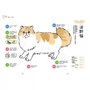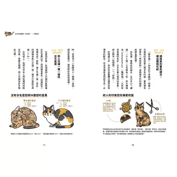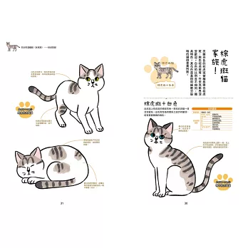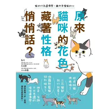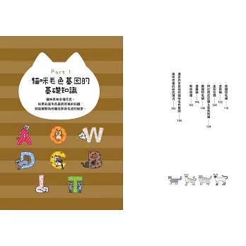 書中詳細介紹7種米克斯及14種純種貓,除了分析牠們在毛色方面的基因表現外,也藉由行為學理論,解析不同花色的貓咪在性格上是否有顯著差異,更全面地介紹了牠們的歷史由來、生活喜好、健康問題以及獨特魅力。