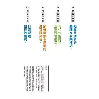 本書採訪了許多整理收納顧問、人氣Instagramer以及其他使用者,介紹他們如何使用無印良品的商品,打造清新舒適的生活環境。