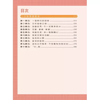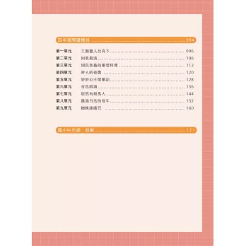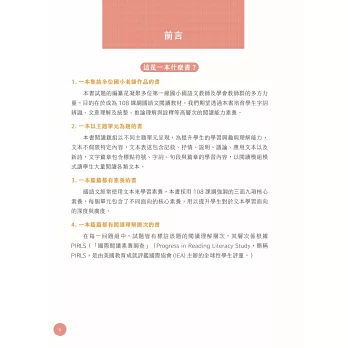 因應新課綱方向,本書結合第一線國小教師與學會教師群力量,設計出一篇篇有趣且有深度的文章,讓學生能夠感受到文字的魅力,並培育國小生的基礎語文能力,逐漸適應長文閱讀,加強文學、文化、評析、審美與感知的素養。題目後面也附上閱讀自我檢測,在檢測的過程中掌握學習情形,為未來的素養做好準備。