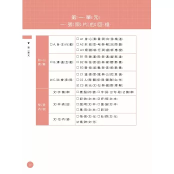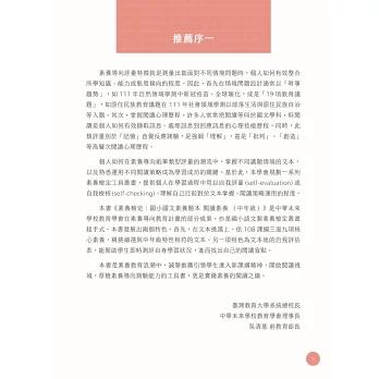本書《素養檢定:國小國文素養題本 閱讀素養(中年級)》在文本挑選上,依108課綱三面九項核心素養,精挑細選與中年級特性相符的文本。另一項特色為文本後的自我評估表,能幫助學生即時測評自身學習狀況,進而找出自己的閱讀盲點。
