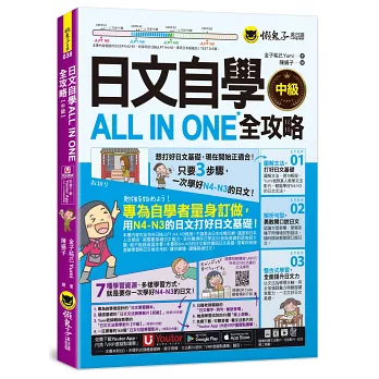 如果你的日文有N5程度,想進一步提升日文能力卻不知道從何下手,只背單字太無聊、只學文法又不會活用、只練會話卻無法舉一反三,《日文自學ALL IN ONE全攻略》是你最好的選擇。《日文自學ALL IN ONE全攻略【中級】》讓你一次學好聽說讀寫、一次穩固日文基礎,跨出學習日文最重要的一步。