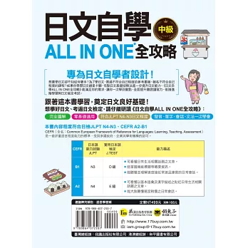 《日文自學ALL IN ONE全攻略》系列依難易度預計分為三個級數,本書為【中級】,其程度符合: