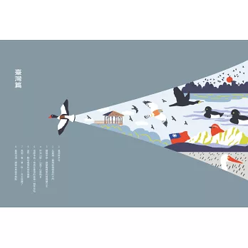 閱讀世界級遷徙線,本書以臺灣篇、東亞澳與全球三大篇章書寫,從熟悉的土地隨著鳥類展開長征,看見世界之美,一次讀懂世界的鳥。