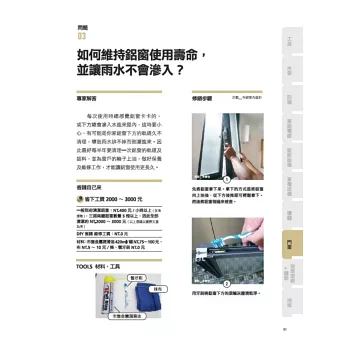 舉例說明:如何防堵衛浴排水孔的小飛蟲或蟑螂?跳電了!該怎麼檢查和維修?漏水了,自己也能更換馬桶水箱的零件!如何幫落地紗門或紗窗更換滑輪?木地板出現疑似蟲咬的小洞孔,怎麼辦?如何確保瓦斯安全?無水源也漏水防水?防水塗料的緊急補救工法!