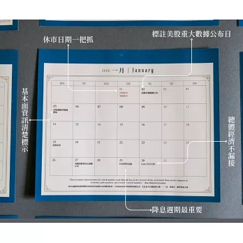 想要掌握先機、學習總經,必須要先從掌握時機開始!不同於常見的假期桌曆,這本桌曆透過標註美股與台股幾大重要日期,幫助投資者在繁忙的日常中能一眼掌握全局。就算你是剛開始投資的小資族,也可能透過這本桌曆,一步一步在生活中內化總經意識。