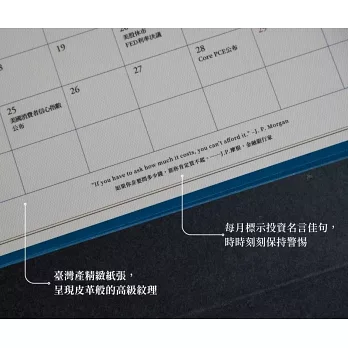為了象徵投資股票的美好願景,此日曆透過精美的普魯士藍特色印刷,恰巧是波克夏控股公司的代表色;紙張上採用充滿理性風格的壓紋紙,展現高貴典雅的不凡氣息。讓這本桌曆,不僅僅乘載了對未來的期待,更是開啟夢想的儀式感。