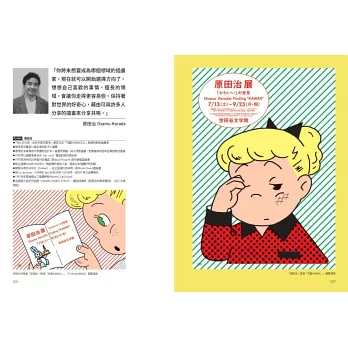 本書一開始以原田治的經驗為例,身為日本可愛KAWAII始祖及領路人,他對插畫有何想法,為什麼他說:「插畫家不算是藝術家,而是能夠讓觀者感到高興的藝人。」他強調插畫的魅力在於娛樂性,他將融合美式風格的插畫嵌入日常生活,從托特包、便當盒、手帕、杯子到文具,甚至開創個人品牌OSAMU GOODS,以品牌定位和設計選擇,為自己的插畫生涯再創高峰。他的歷程能帶給插畫家創作定位和職涯發展許多啟發。