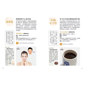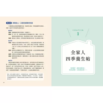 本書九個單元:全家人四季養生帖、全家人小病解救方、緊急時刻緩解法、肥胖調理瘦身術、銀髮族長壽養生經、兒童小病照護帖、女性專屬保健方、男性強健保養術、上班族放鬆身心帖。各族群應有盡有,解決每個人身體不適的煩惱。