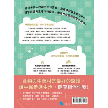 中醫講究體質對症,在食療保健的過程中,針對四季與晝夜更替以及個人生活慣性所引起的症狀,此時家中廚房就能成為日常保養最佳場所;只要是跟著季節性有關的症狀,相對來說也會有當令可應用的食材可供對治,透過本書集結來自中醫經典醫藥書籍與民間驗效小偏方,從而認識古人順應節令所累積的養生智慧。