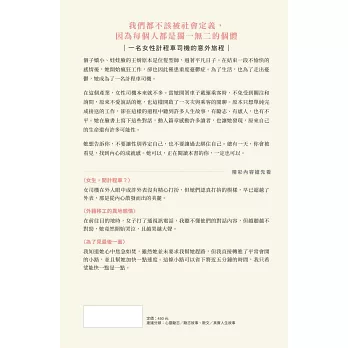「原本我以為人生一塌糊塗,我對世界充滿了恐懼與對於生活的不確定性,我的心情常常嚴重低落,感覺自己處於一個極度幽暗的密室當中,但是當我開始開著計程車,接送著各式各樣的乘客時,遇見了形形色色的人,裡面充滿著勵志與驚奇。」──王婧,本書作者