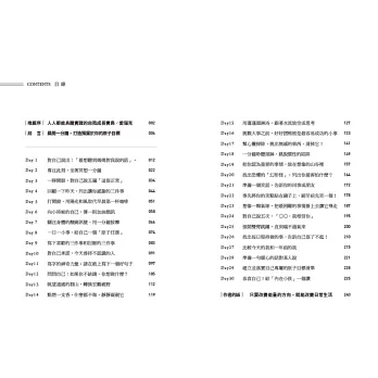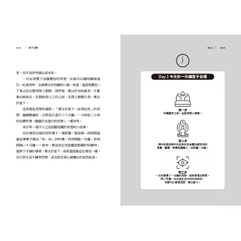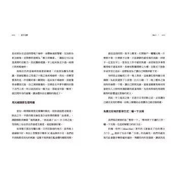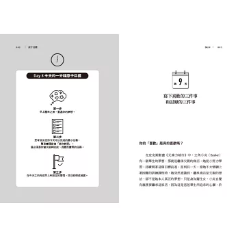 管理時間,並不是一味把行事曆塞滿,而是建立有效率的節奏。作者提出「降低門檻」、「屏除藉口」、「拋開強迫」、「追求樂趣」、「目標階段化」、「尋找意義」等要點,在固定時間、固定地點去執行,就能變成反射動作,日復一日朝自己期待的生活邁進。