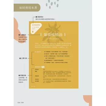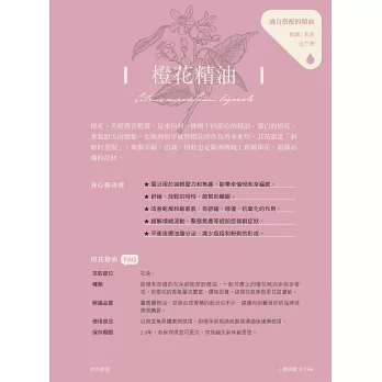 依照月份介紹與月份特質相關的常見精油,循序漸進成為精油達人。除了精油基本知識,也有如何確認精油品質以及身心靈協助上的說明。