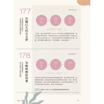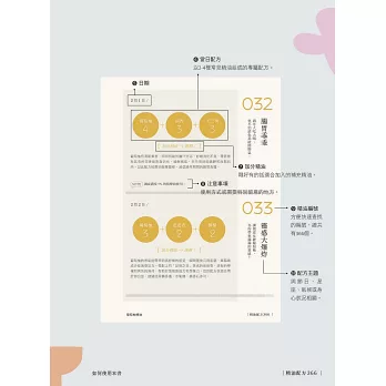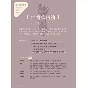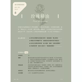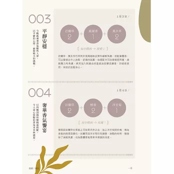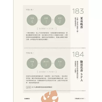 和每天的心情、節氣、節日或天氣搭配的精油配方。一次使用的精油約2-4種,都是常見精油,不用擔心難以取得。