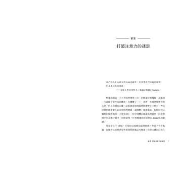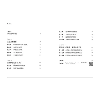 被打斷是生活中的事實。一直如此,不需要什麼花俏的技術。但今天確實存在厲害的技術,有些是故意設計來讓你分心,對你造成干擾。葛洛莉亞.瑪珂博士的書全面回顧了這些干擾對我們生活和心理健康的影響。別被我的評論分散了注意力,去讀這本書吧,它是對這個充滿干擾的世界,一個重要而有價值的貢獻。——唐納・諾曼(Donald Norman),《設計的心理學》作者