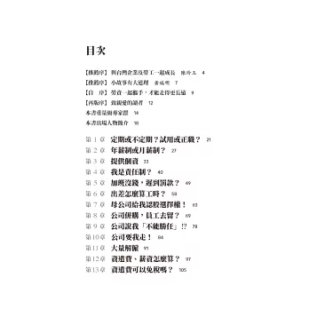 本書以一位剛出社會的年輕人為主角,將他甫獲公司錄取直到退休為止的各個階段,化為32個篇章說明與上班族最常遇到的切身問題,像是約聘轉正職、加班、請假、簽同意書、性騷擾、組織工會、發明專利歸屬、年終獎金、退休金的計算等問題,以易懂的故事方式呈現,也針對每章的情節配備32位國際人資或法務專家,為讀者說明該案例的重點與注意事項。