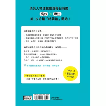 ▌箱型時間真的有用。過去三十多年,我一直在努力將工作與生活打點妥當。我以為自己了解得很透徹,直到我閱讀本書,受到直接而劇烈的衝擊。我養成每天早上製作時間箱的新習慣,這個習慣帶我前往更專注、更平靜、更有生產力的新境界。如果我的史丹佛大學學生今年只能讀一本書,我會希望他們讀這一本。──全球暢銷書《設計你的小習慣》(Tiny Habits)作者B‧J‧福格(BJ Fogg)