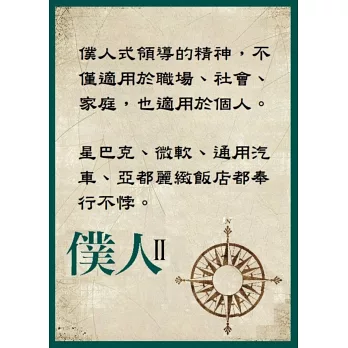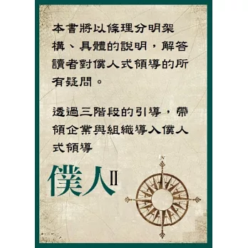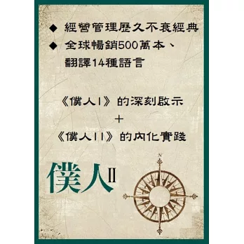 暢銷商業管理經典《僕人I:修道院的領導啟示錄》一書續作。繼《僕人I》之後,本書作者以更具條理的架構、詳實而具體的內容,再次闡述僕人式領導的精義與實踐,以解答讀者對「僕人」的所有問題。作者所倡導的「僕人式領導」,強調的是一種犧牲奉獻的精神,唯有具備恩慈、謙卑、尊重、無私、寬恕、誠實、守信等特質的領導人,才能激發部屬的最大潛能,並成為一位有效率的領導人。