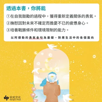 ‧以阿德勒的勇氣金句為基礎,對應生活中的各個面向,不論是工作上還是感情上,皆能引領大家以全新觀點面對各種困境和難題。