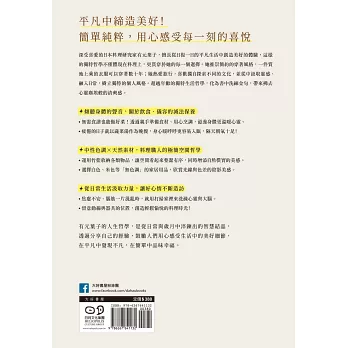 「在現代忙碌的生活中,我們常被壓力壓得喘不過氣。然而,這本書就像是溫暖的一道光,透過作者的分享,捕捉日常中的細小幸福,把日子活成一首詩、把料理變成一幅畫。書中以簡單溫暖的文字,分享料理、穿著和旅行的點滴,展現對自然和真誠的追求。書中還介紹了如何透過整理身心和住所,達到內心的自在與平靜,並強調使用天然食材和減少浪費的重要性。這本書能讓你重新看待生活方式,幫助你找到內心的平靜與幸福。」──廖心筠/收納專家、《姐,整理的是人生》作者