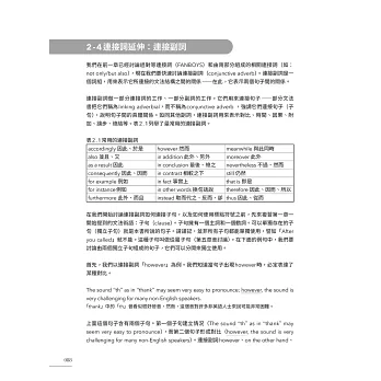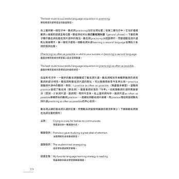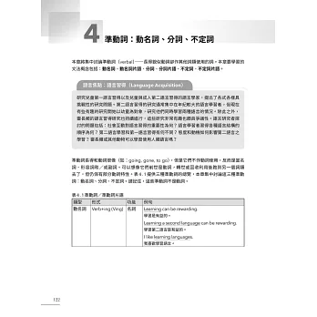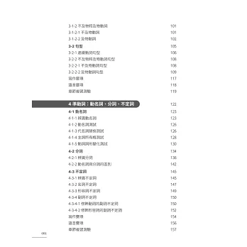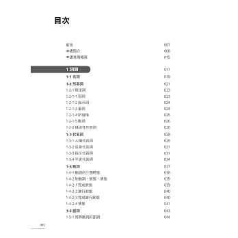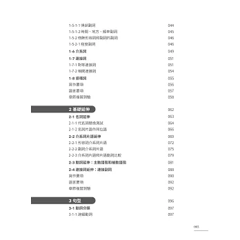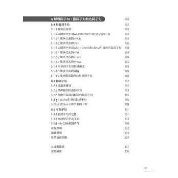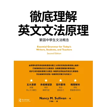 本書五大章節層次脈絡分明,從最小單位詞類、各類動詞及介系詞片語,延伸至動名詞、不定詞、分詞、關係子句等較繁雜的句型結構,輔以貫穿全書的大量應用例句及淺顯易懂的解說,讓讀者在短期內強化基礎概念,確實提升文法程度。