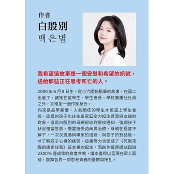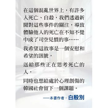 同時也想給處於心理創傷的韓國社會留下一個課題。 ──本書作者 白殷別
