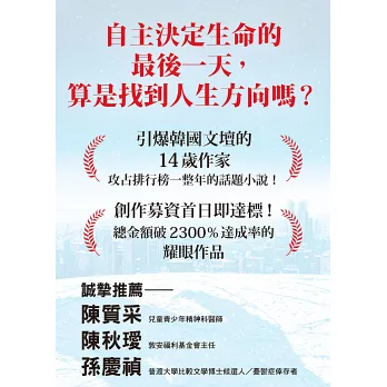 生活在自殺成為青少年十大死因這樣一個時代的作者,透過小說對青少年的「自殺」提出了全新觀點。主角的微妙心理變化,隨著時間流逝而揭露的事件,醞釀出無法擺脫緊張感的沉浸體驗。我想推薦年輕人認識寫出這故事的人,而她今天正坐在學校的教室裡。──徐素敏(徐素敏語言學習心理諮詢中心主任/兒童心理學博士)