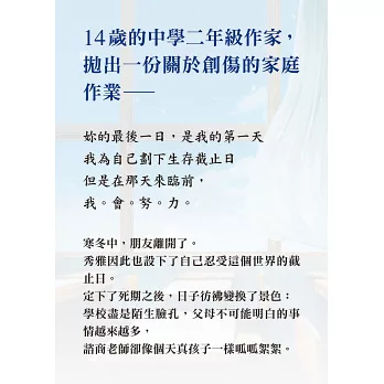 真驚訝我們的孩子竟然會有這樣的對話、想法……而且如此具體考慮死亡的問題,還把自殘當成時尚的行為。我們這些大人真的把孩子逼到這樣的絕境嗎?不禁感到心痛萬分。──yes24書店讀者心得